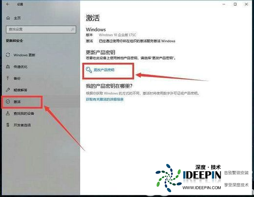3、接着点击左边的“激活”,然后点击右边的“更改产品密钥”。