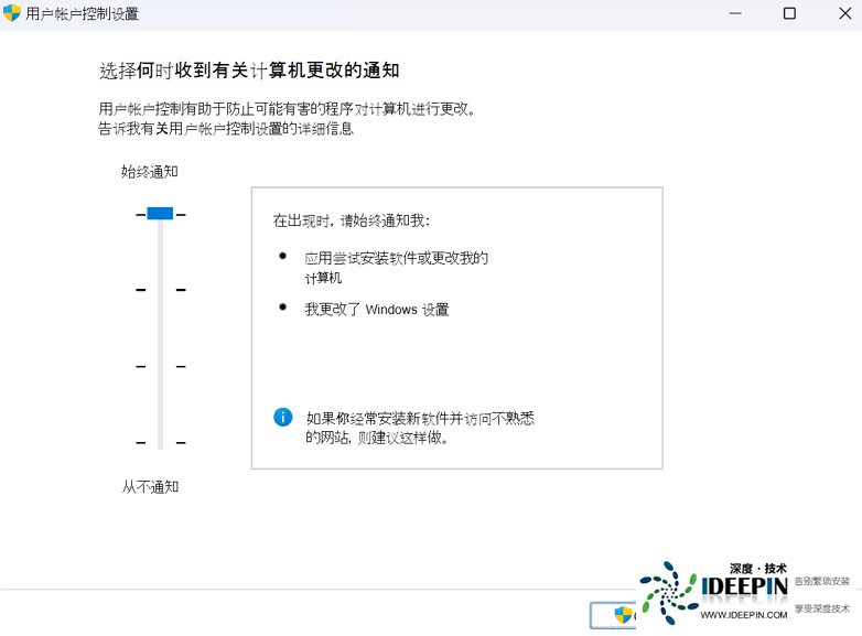 把滑块从 从不通知(最底) 拉到 默认:仅当应用尝试更改时通知我。